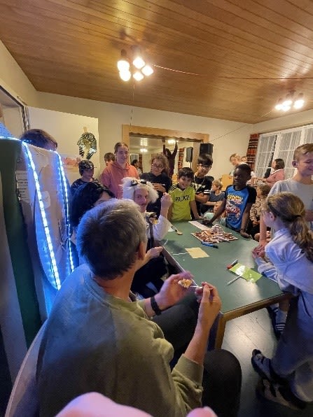 An diesem Tag landeten wir im Mittelalter. Die Aufgabe war es, für die Königin und den Forscher geheime Botschaften zu entschlüsseln. Nach dem Frühstück standen zwei Aktivitäten auf dem Tagesplan: der Hochseilgarten und das Basteln. Das Bastelprojekt war ein Mühlespiel aus Stoff, welches sich gut als Reisespiel eignet. Wer noch Lust hatte, durfte im Anschluss aus Salzteig einen Anhänger oder Glücksbringer formen, oder auch ein Lesezeichen mit Hieroglyphen gestalten. Der Kreativität waren keine Grenzen gesetzt. Einige nutzten die Zeit, um Geschenke und Mitbringsel für ihre Familie zu basteln. Beim Seilpark war für jede:n etwas dabei, es gab einfachere sowie auch etwas anspruchsvollere Routen. Die Teilnehmenden wurden gut instruiert, wie sie sich sichern mussten, sodass sie ohne Furcht klettern konnten. Als alle wieder zurück im Lagerhaus waren, gab es Nachtessen, ein leckeres Resten-Buffet. Und wieder kam nach dem Nachtessen hoher Besuch vorbei, nämlich die mittelalterliche Königin. Nachdem sie uns weitergeholfen hatte, wurde mit einer Disco gefeiert. Es wurde gemeinsam getanzt, gelacht und es gab noch ein kleines Dessert zum Schluss vom Tag.