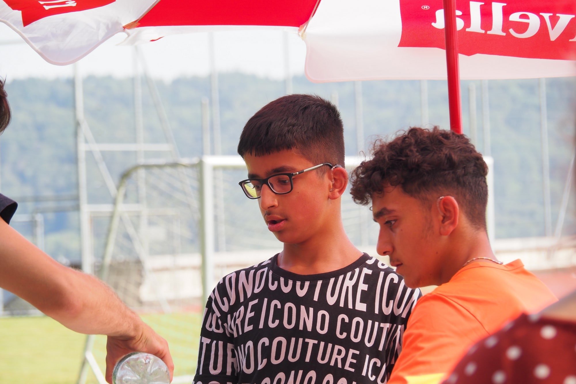 Am Rand des Fussballplatzes: 2 Sonnenschirme, 1 Wagen mit Wasserflaschen